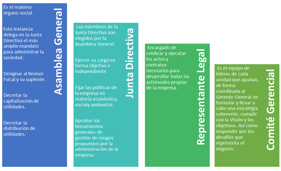 La estructura de gobierno representa el orden jerárquico con el cual la empresa funciona y cumple con su plan estratégico. Estos órganos jerárquicos desempeñan sus funciones separadamente, conforme a las leyes y dentro de las facultades y atribuciones que les confieren los estatutos sociales. La sociedad, además, cuenta con un revisor fiscal elegido por la asamblea de accionistas para períodos de un año.