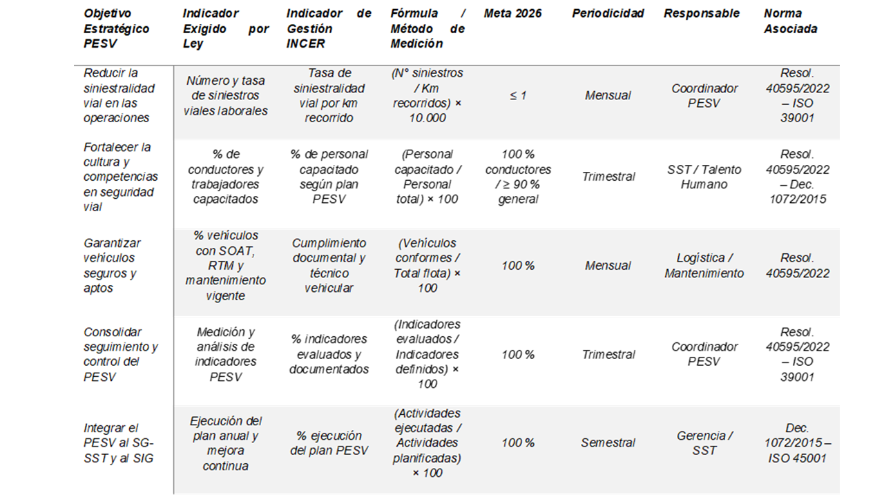 Este capítulo constituye el núcleo técnico del Plan Estratégico de Seguridad Vial (PESV) de INCER S.A.S., en el cual se establecen los objetivos estratégicos, las metas cuantificables y los indicadores de seguimiento, definidos conforme a los lineamientos y criterios obligatorios establecidos en la legislación colombiana vigente.
